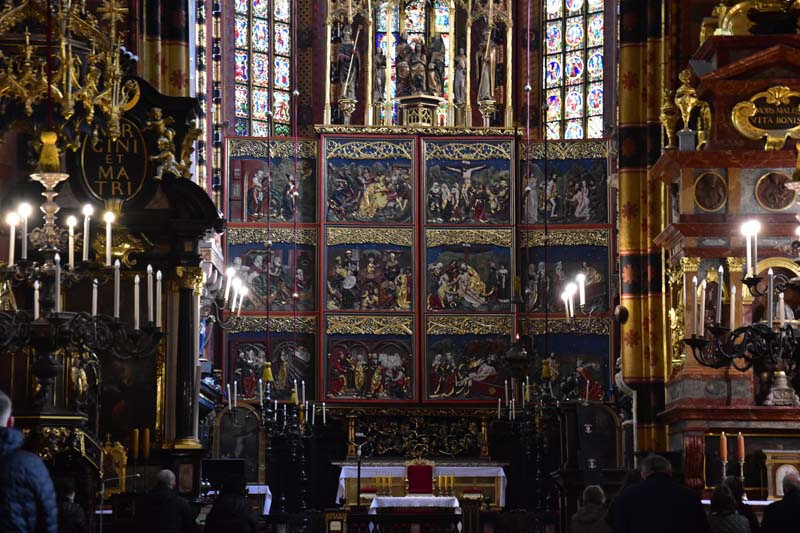 Il nous restait encore une chose que nous ne voulions pas rater, c’est l’intérieur de l’Eglise Notre-Dame que nous n’avions fait qu’apercevoir le premier jour puisqu’une messe y était célébrée quand nous y sommes passés. On remarque tout d’abord la hauteur de la nef, les fresques murales, raffinées et colorées et en levant les yeux, le remarquable plafond bleu couvert d’étoiles. C’est en accord parfait avec le somptueux retable qui mesure 13 mètres de haut et 11 mètres de large. C’est la pièce d’art médiéval la plus importante et la plus imposante du pays… Consacré en 1489, il demanda 10 ans de travail. Les vitraux qui entourent l’autel principal datent de la fin du 14ème siècle.